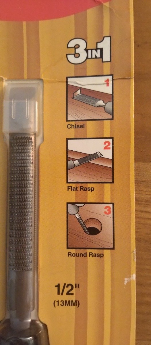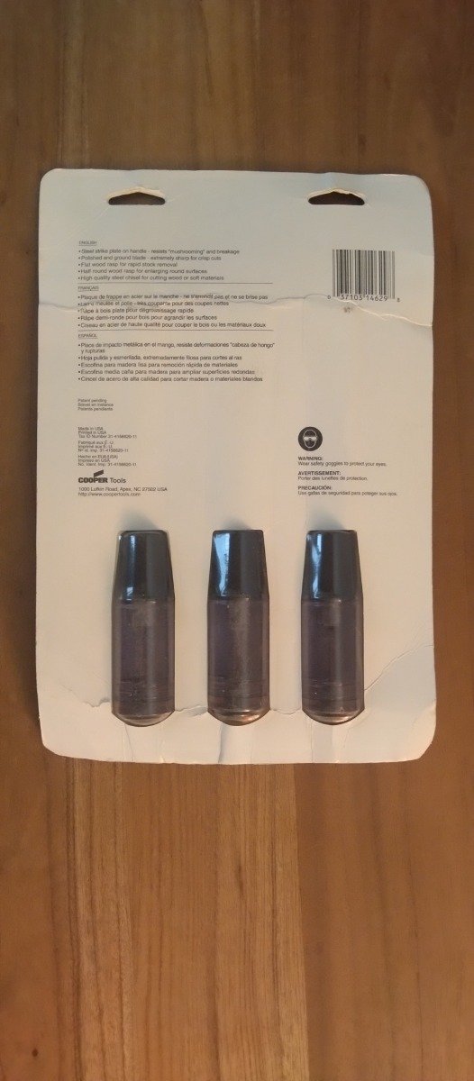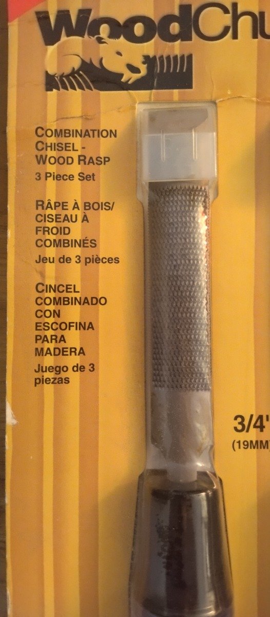 Juego de 3 formones con escofina Nicholson, nuevos de antiguo stock en blister sellado, vienen en las 3 medidas más usadas: 12 mm-19 mm-25 mm, ideales para redondear espigas y hacer todo tipo de desbaste, tienen escofina (plana y media caña) de ambos lados y también en los cantos, vienen con tap metálico para poder golpearlos sin dañar el mango, Made in Usa.